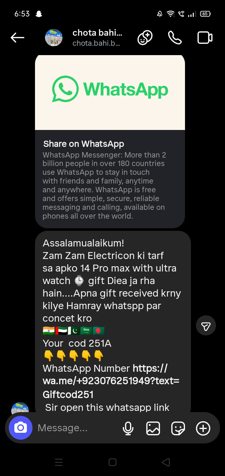 "This account scams people using the name of Zamzam Electronics Shop. They send Instagram messages claiming you won expensive electronics or ask you to complete simple tasks. After contacting you on WhatsApp, they request shipping fees (₹2000–₹4000) and then block you after your online payment. Their..."