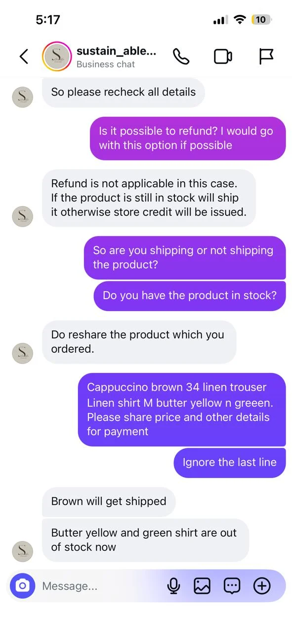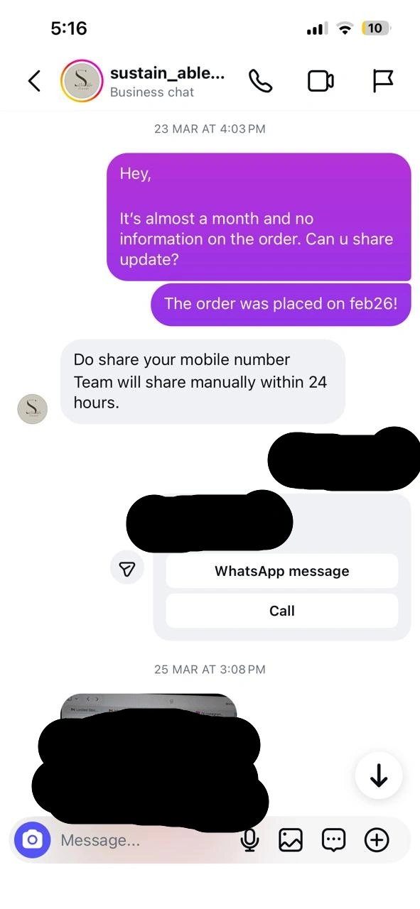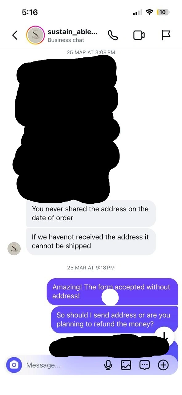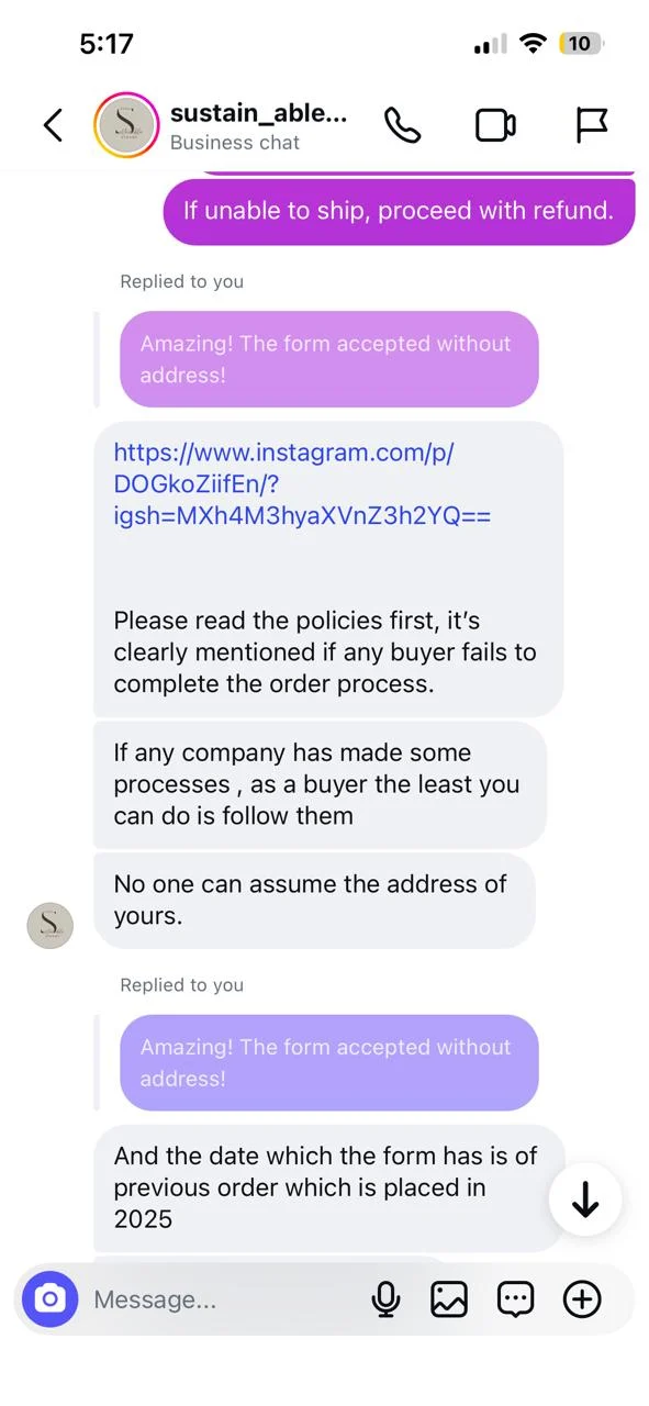 "I recently ordered from an Instagram clothing store (IG handle - "sustain_able_closet") and wanted to share my experience so others can be cautious. The delivery was significantly delayed beyond the promised timeline There was no proactive update from their side On following up multiple times, I didn’t get a clear confirmation on whether the order was even shipped In one of the conversations,…"I recently ordered from an Instagram clothing store (IG handle - "sustain_able_closet") and wanted to share my experience so others can be cautious. The delivery was significantly delayed beyond the promised timeline There was no proactive update from their side On following up multiple times, I didn’t get a clear confirmation on whether the order was even shipped In one of the conversations, instead of addressing the issue, the seller responded rudely and shifted the blame onto me, claiming I hadn’t provided proper details (which I had) The details were shared in google forms and upon furnishing all the details - the insta shop owner had the audacity to blame me. It's sheer common sense that without furnishing the details - the form won't have a submission complete status The insta store owner displayed a narcissistic behavior I’m attaching screenshots of the conversation for full context. Not saying everyone will have the same experience, but based on mine, I’d strongly suggest to refrain from transacting with this provider. “This didn’t feel professional or trustworthy at all.” “Decide for yourself after seeing the screenshots.”