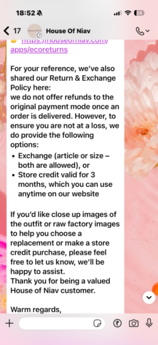 "If there was lower than 1 star, I would give this brand exactly that. Their clothes are of the most horrible quality, they write “premium French crepe” “muslin with cotton lining” but they’re the lowest quality polyester. The kind of fabric that makes noise when it rubs, or even when you wear it. Their return policy is as such that they will only do exchange and store credit, no refund. So…"If there was lower than 1 star, I would give this brand exactly that. Their clothes are of the most horrible quality, they write “premium French crepe” “muslin with cotton lining” but they’re the lowest quality polyester. The kind of fabric that makes noise when it rubs, or even when you wear it. Their return policy is as such that they will only do exchange and store credit, no refund. So basically the are scamming customers into thinking they are selling good quality clothing but they send you clothes worse than roadside clothing and you cannot get a refund. Even if you return, buying something else from store credit is a trap because they’re all the same horrible quality. Also there is no standardized measurements, clothing of the same size fit very differently! They also smell horrible or disgusting chemicals perhaps! This is not an isolated incident, there are many customers with the same complaints, influencers even. What’s even worse is that they hide all negative reviews and comments from Instagram. Shocked to see how businesses like this are allowed to operate. NEVER BUY FROM THIS BRAND. Strict action should be taken against such practices by brands. The image shows the fabric on the inside.
