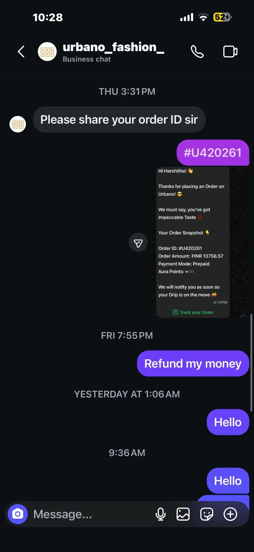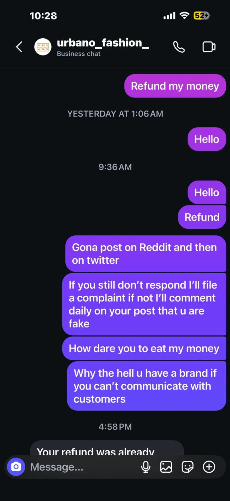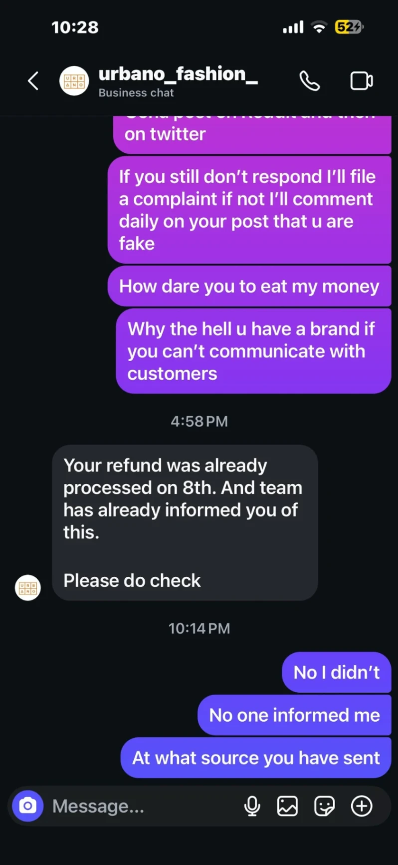 "TITLE: Urbano fashions website scam BODY: Hi everyone, I’m sharing my experience with Urbano Fashion to see if anyone else has faced something similar or has advice. I ordered multiple jeans from Urbano Fashion, but the quality wasn’t good, so I returned 5 jeans following their return process. On their website/app, the refund status shows “Refund Completed”, but I have not received any money in…"TITLE: Urbano fashions website scam BODY: Hi everyone, I’m sharing my experience with Urbano Fashion to see if anyone else has faced something similar or has advice. I ordered multiple jeans from Urbano Fashion, but the quality wasn’t good, so I returned 5 jeans following their return process. On their website/app, the refund status shows “Refund Completed”, but I have not received any money in my bank account / original payment method. What’s more frustrating: • I tried contacting their customer support, but I couldn’t reach them properly. • I commented on their social media posts asking about my refund — those comments were deleted. • I messaged them on Instagram. After many follow-ups, they finally said the refund was done on 8th, but no amount has been credited. • When I asked them for refund reference details / source of refund (bank, UPI, gateway, transaction ID), instead of resolving it, they blocked me. Has anyone else faced refund issues with Urbano Fashion? Any suggestions on what I should do next — consumer forum, bank dispute, or something else? Thanks in advance.