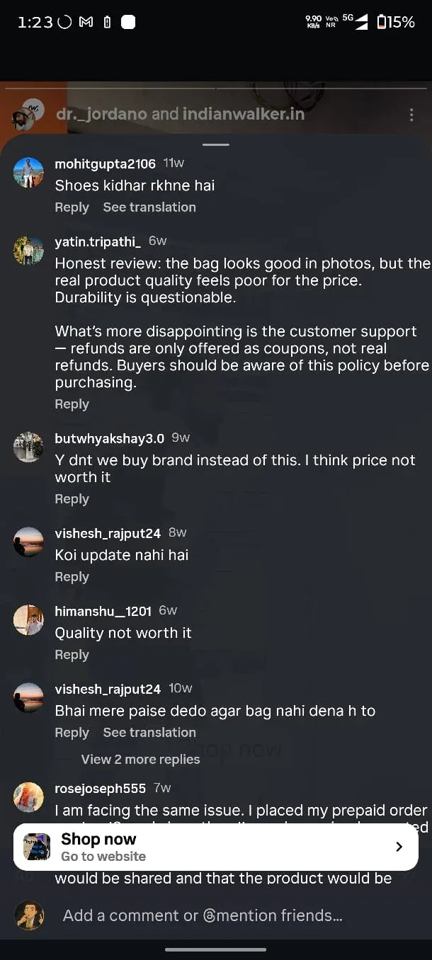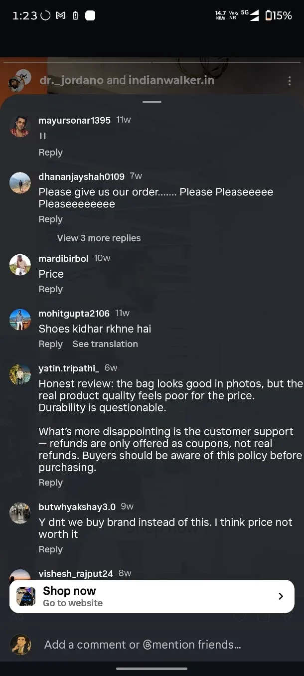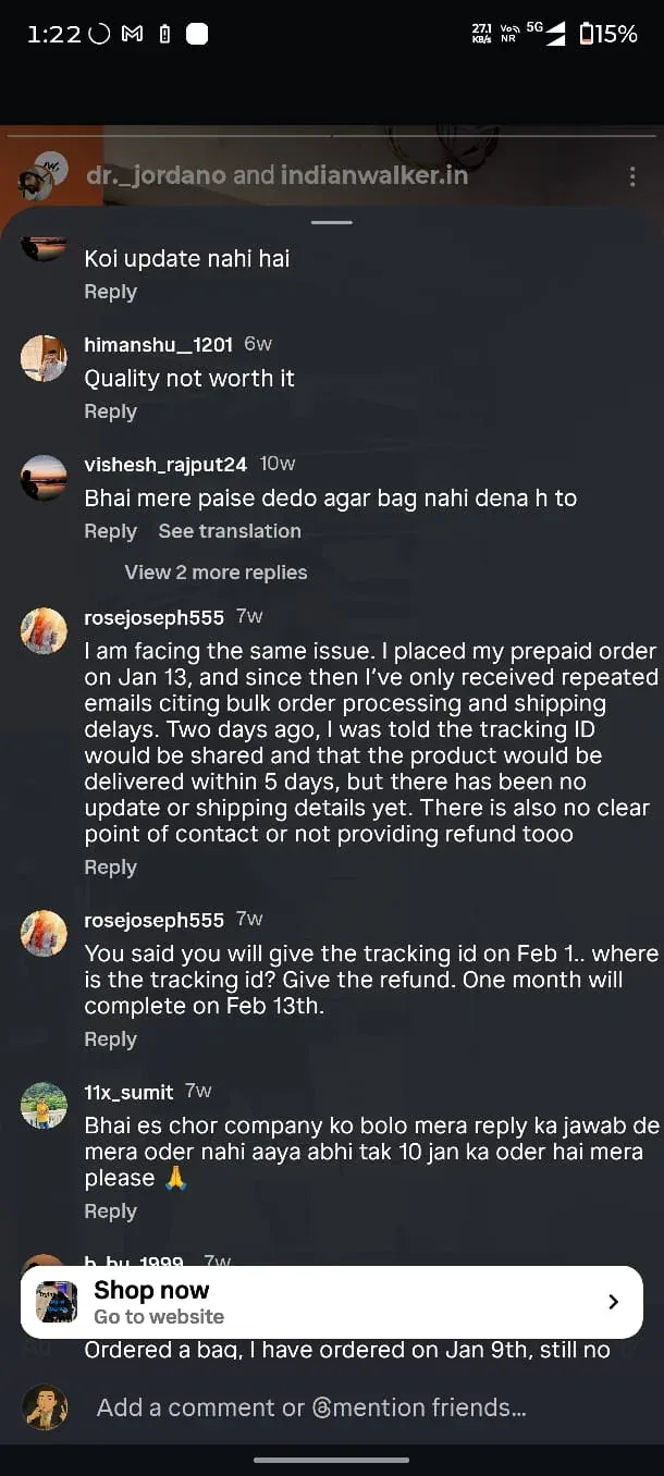 "TITLE: Indian Walker Scam BODY: I placed a prepaid order 11 days ago. They promise shipping within 0-7 days. No updates. I started messaging them on WhatsApp and Instagram. Also mailed them on their "support" email address. No response anywhere. I even messaged the guy directly on Instagram. Still no response. Then I started exposing their scam on their Instagram posts. Finally got 1…"TITLE: Indian Walker Scam BODY: I placed a prepaid order 11 days ago. They promise shipping within 0-7 days. No updates. I started messaging them on WhatsApp and Instagram. Also mailed them on their "support" email address. No response anywhere. I even messaged the guy directly on Instagram. Still no response. Then I started exposing their scam on their Instagram posts. Finally got 1 reply, asking me to provide order details and send an email to the same email ID I had already mailed. In that very chat, I had already shared all the details including the order ID and my grievance, but they didn’t even bother to scroll up. Soon I realized they started deleting comments. A few other people had similar issues, and suddenly their comments also vanished. They didn’t respond to me, but kept deleting comments. This guy’s registered address is in Laxmi Nagar, looks like a flat address - probably fake ? I have paid around ₹2.2k. Can someone guide me on what steps I can take now? This Md. Sakib guy from Indianwalker is running a scam. I tried calling the WhatsApp number - no answer. Now it is switched off. They are really good at deleting comments apparently, which is why I couldn’t find any scam alerts before ordering. But after digging, I found an ad post where they forgot to delete them. Adding screenshots in replies. They have created so many high-quality reels, the owner shows his face in almost all of them. He has posted many travel reels on his personal account. They even had photos of packed orders. Had no idea people can go through so much effort just to scam. Literal lowlifes. Need to be extra vigilant from now on. These scammers also have a YouTube channel, and there are similar scam comments on their shorts. I feel depressed. All details in screenshots. Edit: I have been blocked from the Instagram page and the founder Md.Sakibs account.